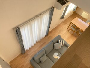 シンプルなインテリアがご希望だったので、ソファーのカラーと質感がピッタリなベーシックデニムシリーズの中から選んで頂きました。吹抜けは操作性と耐久性を考えてロールスクリーンを提案しました。1Fリビングからチェーンで開閉操作出来ます。