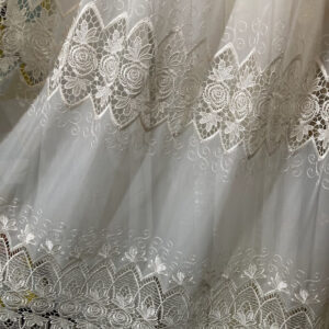 お客様も全く同じご希望で、エンブロダイリー(刺繍)のシアーカーテンとなりました。結果、横長2列の刺繍は明るい大きい窓にとても美しく見えました。
